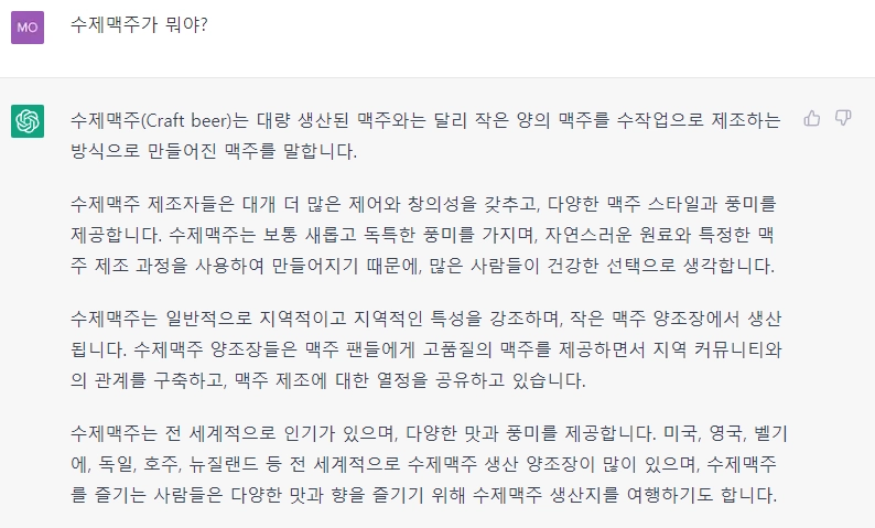 당연히, 가장 먼저 짚고 넘어가야할 것은 무엇이 수제맥주인가이다. 내가 찾으려고 하는 것이 무엇인지도 모르는 여행이 성공할 수 있겠는가. 수제맥주가 유행하면서 펍이나 편의점에서도 쉽게 만날수 있게 됐지만 정작 수제맥주가 정확히 어떤 맥주를 말하는 지에 대해서는 크게 관심이 없다. 요즘 핫한 친구인 ChatGPT에게 물어보았다.