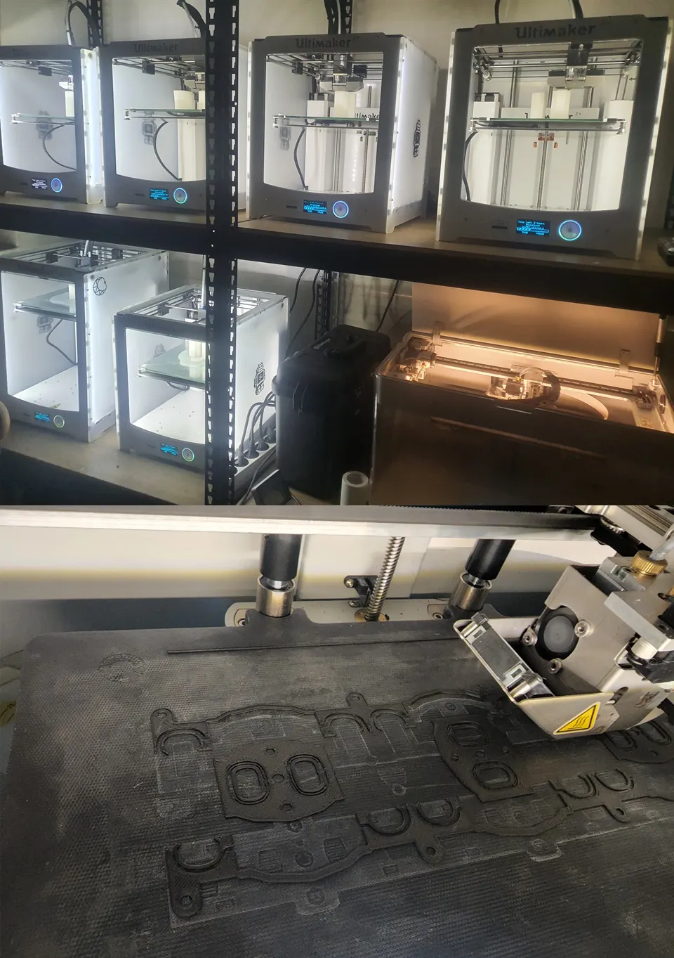 10 대의 네덜란드제 3D 프린터 Ultimaker와 미국 메사츄세츠의 특수 3D 프린터 Markforged onyx는 여전히 필라멘트를 내뿜고 있습니다.