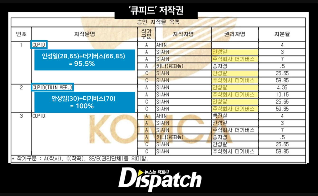 원래 ‘CUPID’는 스웨덴 학생 3명이 원곡을 작곡했다고 합니다. 그런데 안성일 대표가 이들에게서 음원을 구매해와서 한국적으로 편곡했다고 하는데요. 음원을 구매할 때 저작권도 2차저작물작성권을 포함하여 양도받았다면 음원을 구매한 사람은 이를 편곡해서 새로운 곡(2차저작물)을 만들 수 있습니다. 음악 프로듀서인 안성일 대표는 이런 방식으로 음저협에 ‘CUPID’ 원곡의 저작권자로 등재를 한 것이죠.