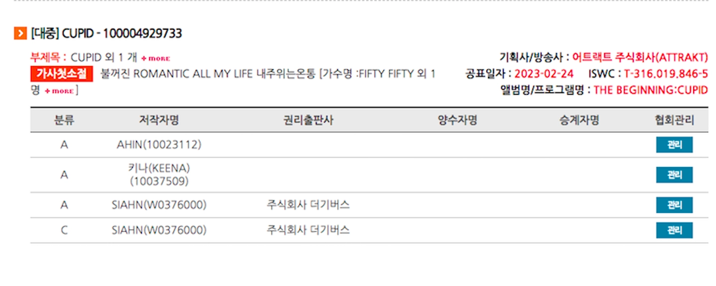 한국음악저작권협회(KOMCA, 음저협)에서 검색해봤습니다. 미국의 빌보드 핫 100에 11주 연속 차트인한 ‘피프티 피프티’의 히트곡 ‘CUPID’.