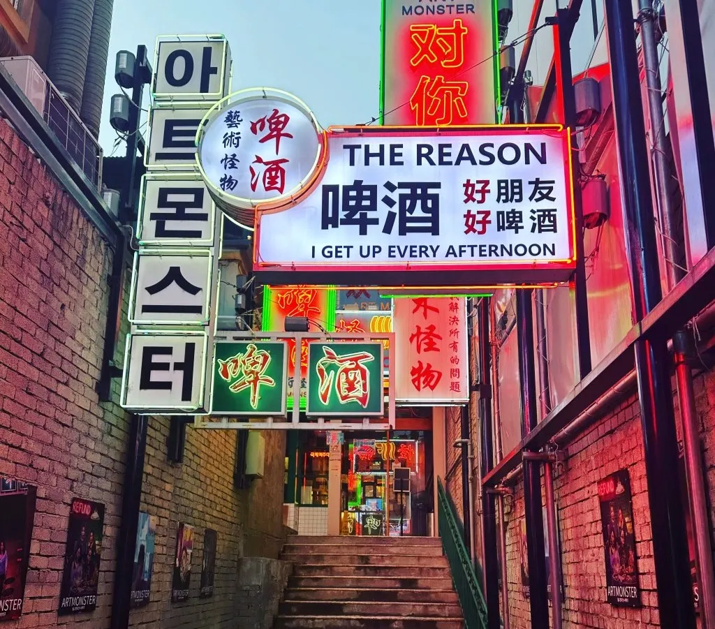 예술같은 맛의 맥주를 추구하는 아트몬스터 브루어리의 강남 직영점. 아트몬스터의 직영펍들은 각각 독특한 컨셉으로 인기를 끌고 있다. 강남점은 입구부터 홍콩에 온듯한 느낌이 들게 하는 간판과 네온사인이 특징이다.