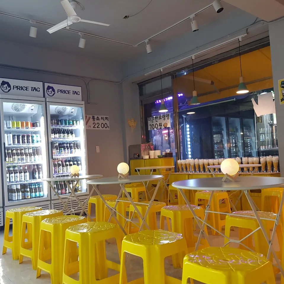 앞서 소개한 우리슈퍼가 20년 넘은 보틀샵의 성지라면 달맥슈퍼는 우리슈퍼의 자리를 넘보는(물리적으로는, 이미 우리슈퍼의 자리를 차지한) 떠오르는 보틀샵이다. 달맥슈퍼의 마스코트가 들어간 간판에서부터 우리슈퍼 보다는 젊은 느낌이다. 깔끔한 화이트 톤 인테리어 바탕에 곳곳에 배치된 노란색 테이블과 의자는 톡톡 튀는 포인트가 된다.